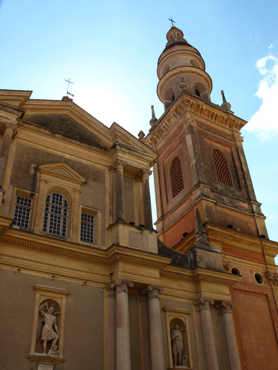 マントンにあるサン・ミッシェル教会は、この地方のバロック建築らしい淡い黄色やピンクの壁に、大きな鐘楼を持つ建物で、旧市街のシンボルとなっています。旧市街は迷路のような路地になっていますが、建物と建物の間から見えるこの鐘楼を目指して歩いて行くと、教会前の広場にでます。中の装飾もすばらしいそうですが、入れるのは15時から17時半までだそうで、私たちは時間が合わず外から眺めるだけでした。