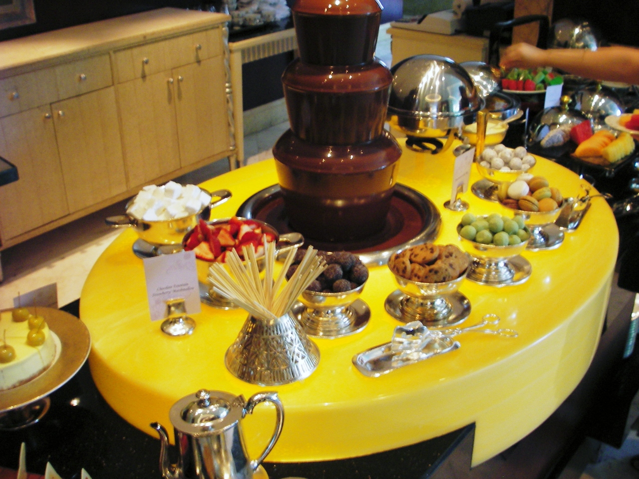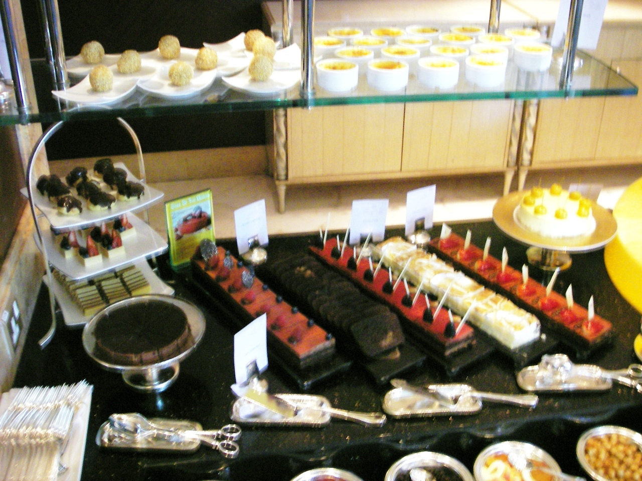 シャングリラに宿泊していたので、利用してみました。お料理はホットミール、コールドミールいろいろありましたが、思っていたよりは品数は少なかったかな。デザート類は充実していて、どれもおいしかったです。サンドウィッチやお寿司などもあるので、お料理を軽くつまんでデザート中心に楽しみたいという人にはピッタリかも。紅茶は100種類以上あるので選ぶのに苦労します。「シャングリラ」という名前の紅茶をたのむ人が多いみたいですね。もちろん私もたのみました。途中で紅茶の種類を変えることができるプランもあるので(一番安い料金は最初に1種類のみ)、紅茶好きの人は試してみては?私もことプランを利用して、2回目はアールグレー系にしました。