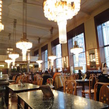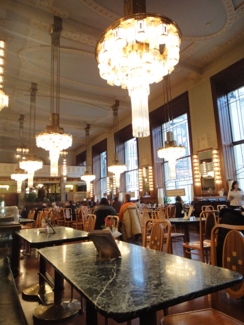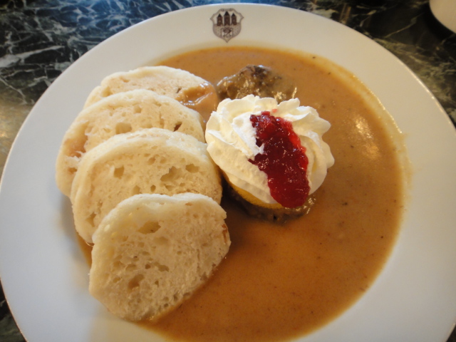 共和国広場にある市民会館内のカフェです。夏はテラス席もいっぱいでなかなか席を見つけられませんが、冬はお昼時でも楽にすわれました。メニューは伝統的なチェコ料理が中心です。ローストビーフのクリームソースを頼んだところ、おいしくてびっくりしました。