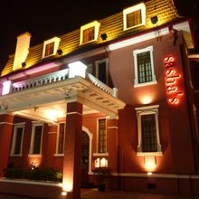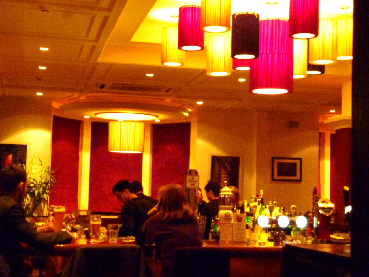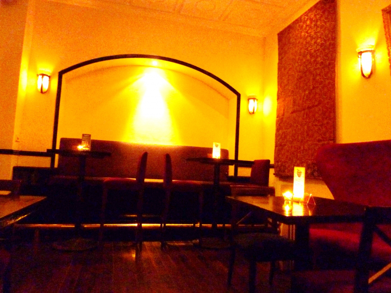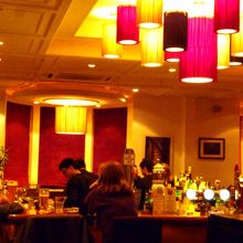 夜10時くらい行くと、入口で「For dinner?For drink?」と聞かれ、「Dinner」と答えると、奥のレトロな雰囲気の部屋へ案内されました。歴史がありそうな木のテーブルに、ワインレッドのベロアのソファがとてもオシャレでした。