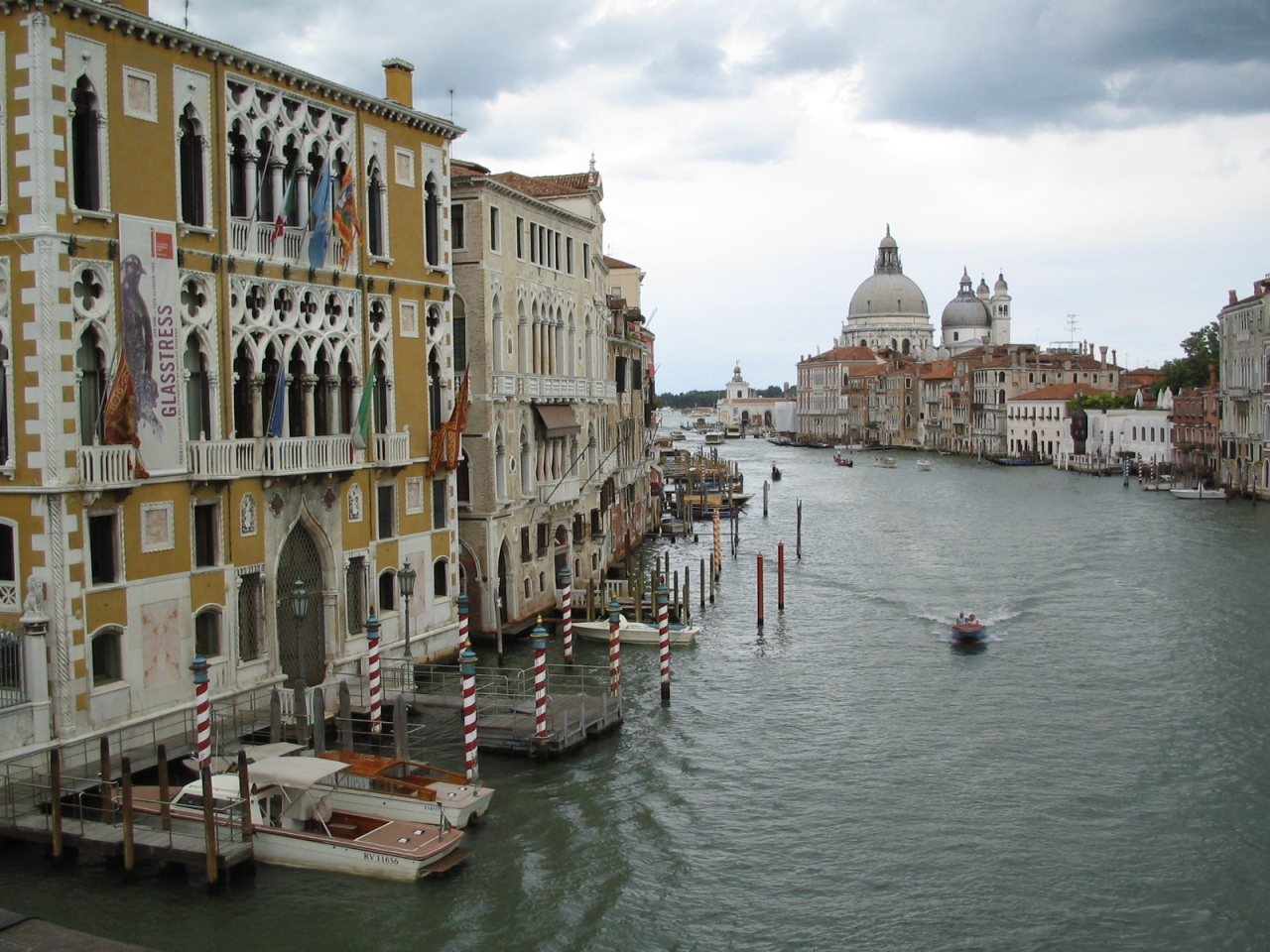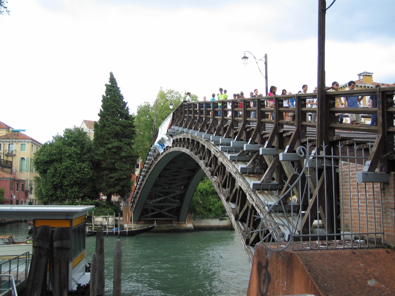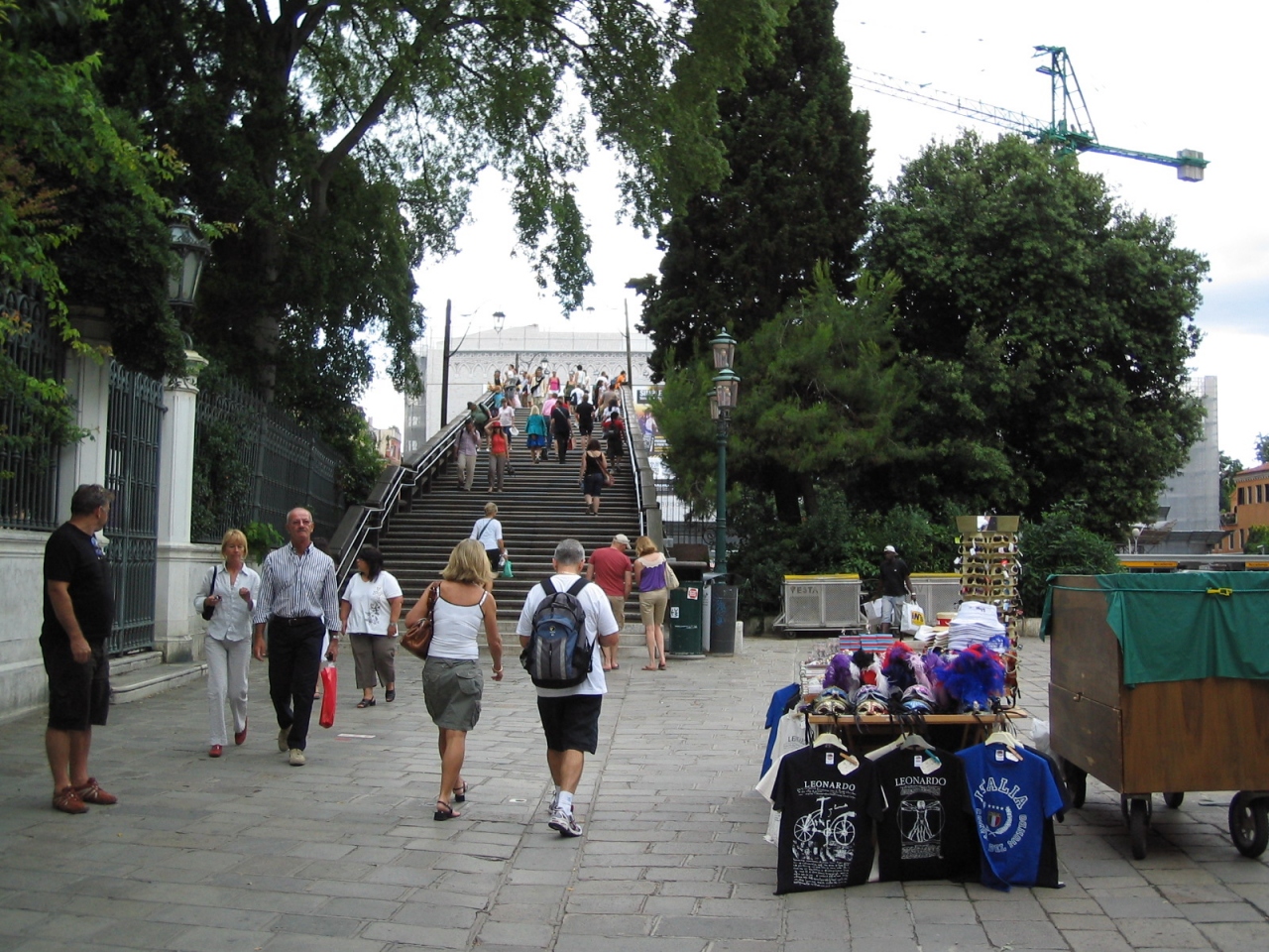 サンマルコ広場から曲がりくねった道を行くと橋の広場に出ました。木を様々に組み合わせて緩やかなカーブを描いている。東を見れば運河の上にサルーテ教会が見える。西側の運河は右に大きくカーブしている。リアルト橋の賑やかさに比べ静かで落ち着いた景色でした。
