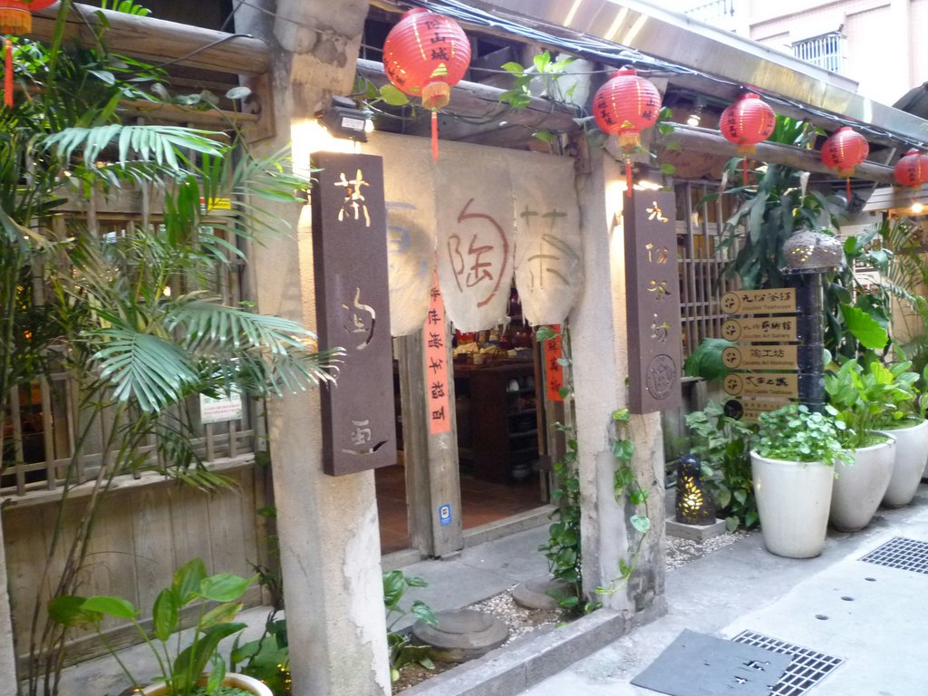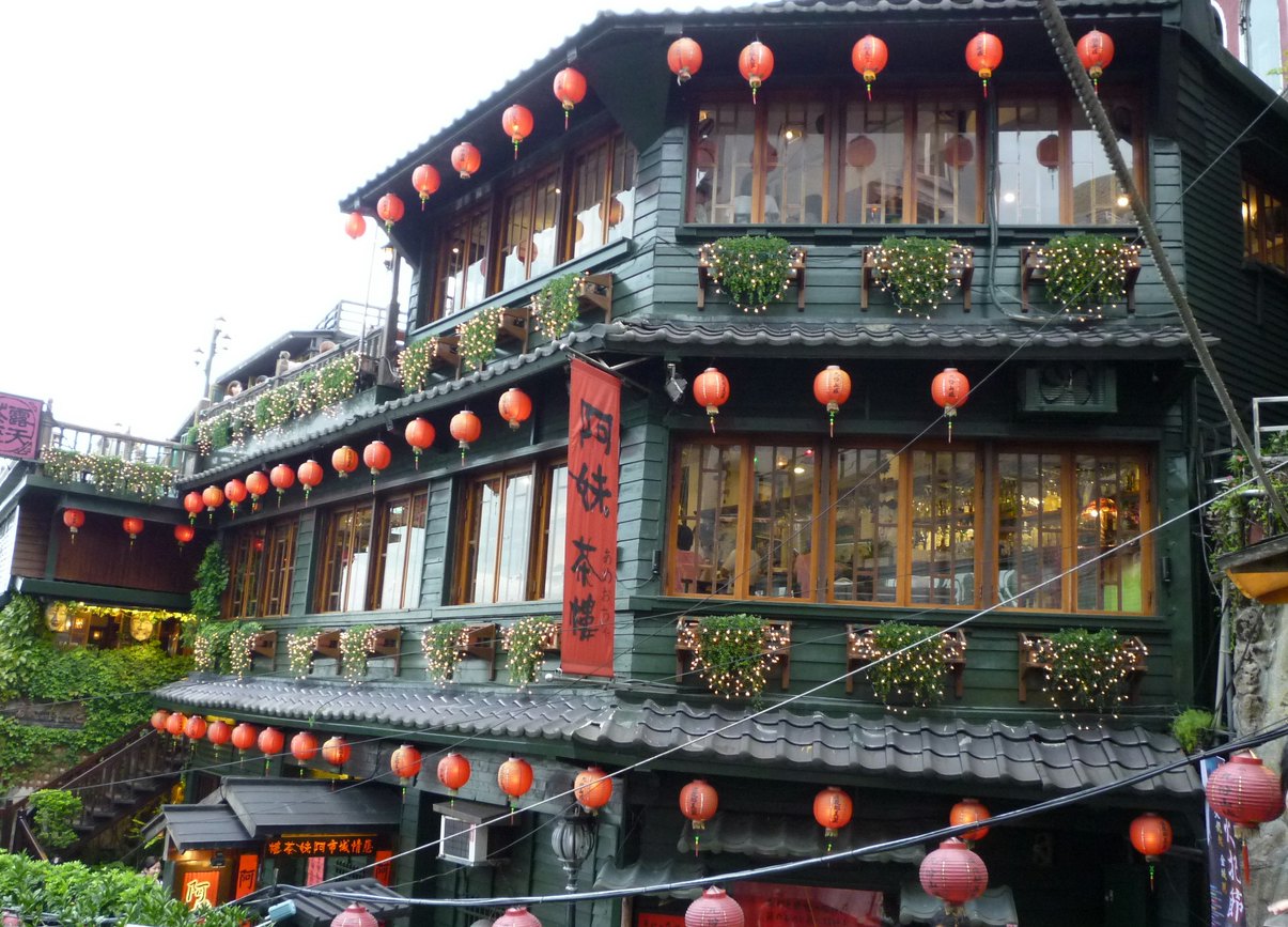 バスを降りて、土産物屋さんやローカルグルメの店をのぞきながら並ぶ細い坂道を登って行くと展望が開け海岸まで見通すことが出来ます。そのそばの石段を少し下ると「千と千尋の神隠し」のモデルになったという「阿妹茶楼」が赤い提灯に飾られています。