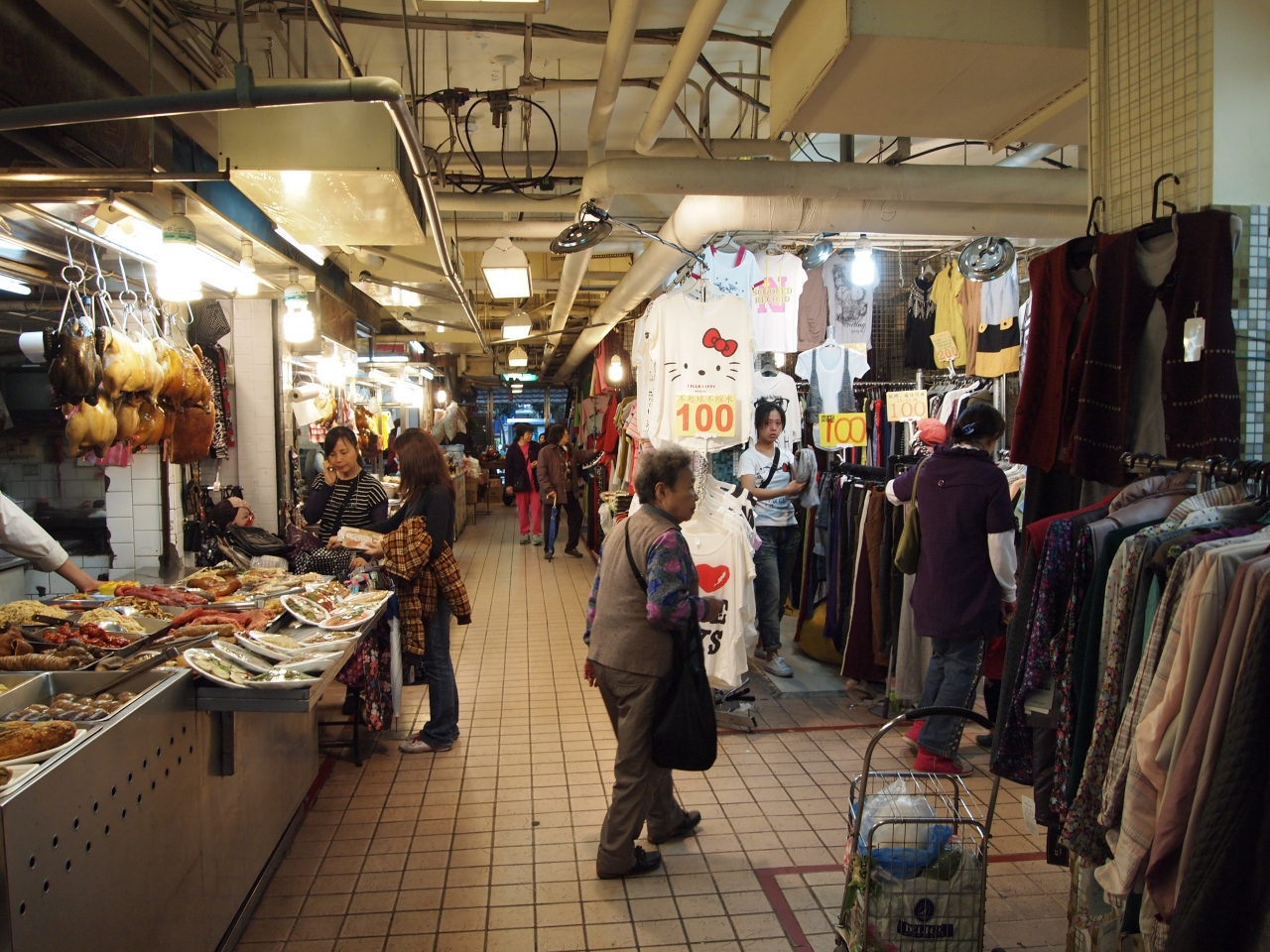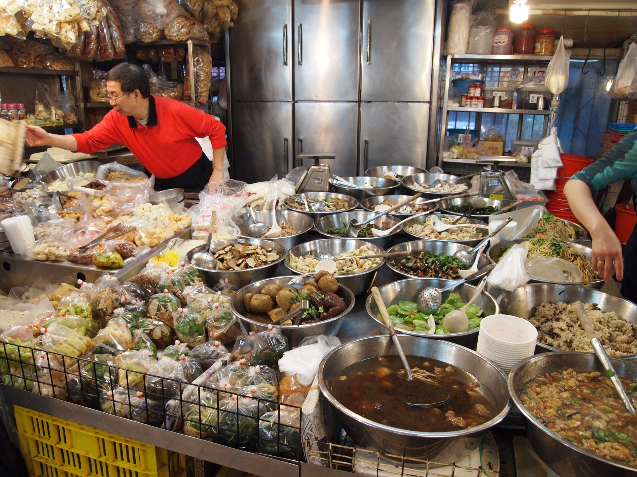 市場には生鮮野菜、果物、肉類や調理済みの簡単な食材が売られています。