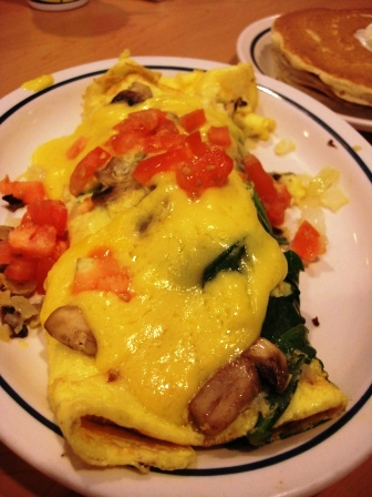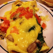 アラモアナ通りのアクアパームス&スパ・ホテルの1階にあります。店内はとても広いです。そしてワイキキのお店に比べると全然混んでないです。ランチを食べに行きました。チキン・モッツァレラ・オニオンのフライとオムレツを食べました。オムレツにはパンケーキが付いてきます。オムレツはチーズがとろとろでとても美味しかったです。パンケーキもふわふわでした。