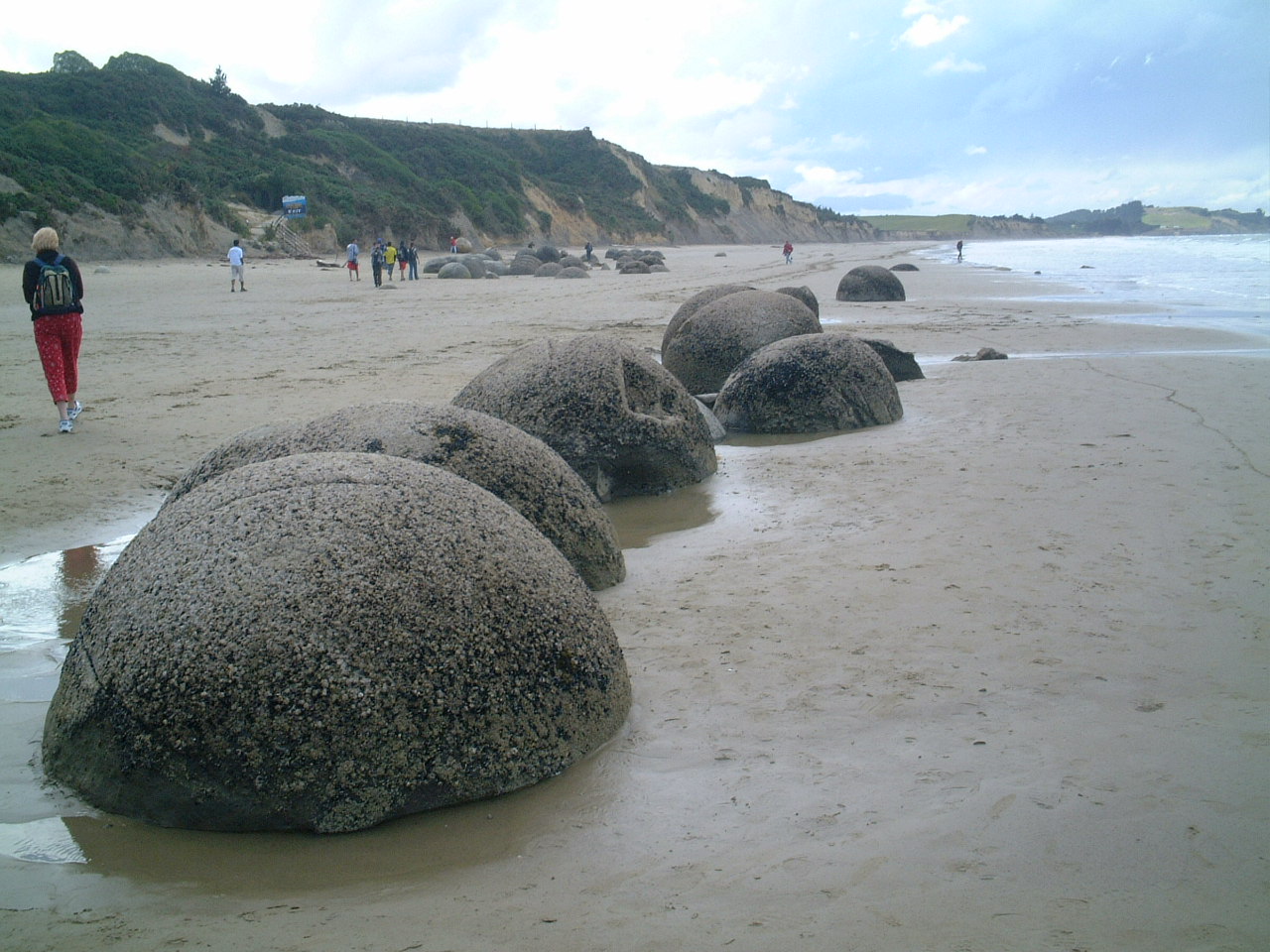 Oamaruの南40kmの場所にあるMoerakiには、不思議で巨大な丸石が海岸のいたるところに転がって、砂岩の崖から今にも出てきそうな状態のものもあります。