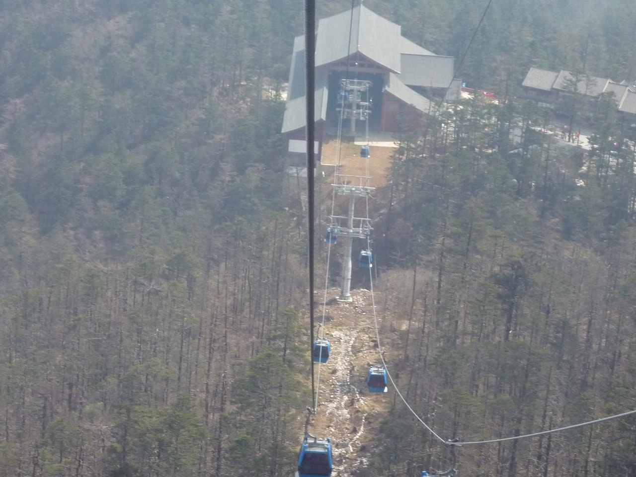 ロープウェイは180元と高め、シーズン前だが大行列。入場券のアルファベットの順に放送があるので、ロープウェイに乗り込む。