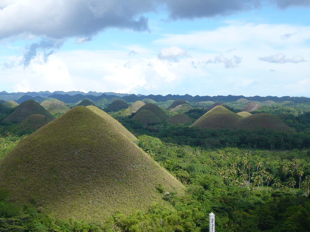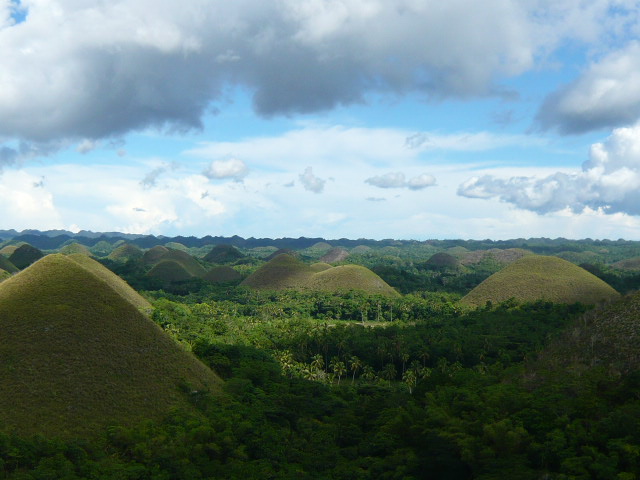 スコールが上がった直後で、青空に白い雲がもくもく。その雲の陰がチョコレートヒルズに写っていて、良い景色でした。