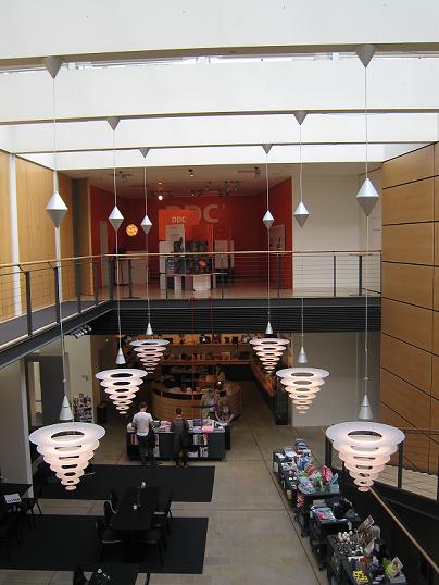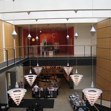 コペンハーゲン中央駅から歩いて行ける距離にあります。市庁舎を通りぬけ真っすぐ歩いていると左手にあるガラス張りの建物です。中へ入るとすぐに土産物コーナーがあります。カフェテリアもあって、ここの照明のデザインがくるくるしていてかわいいです。