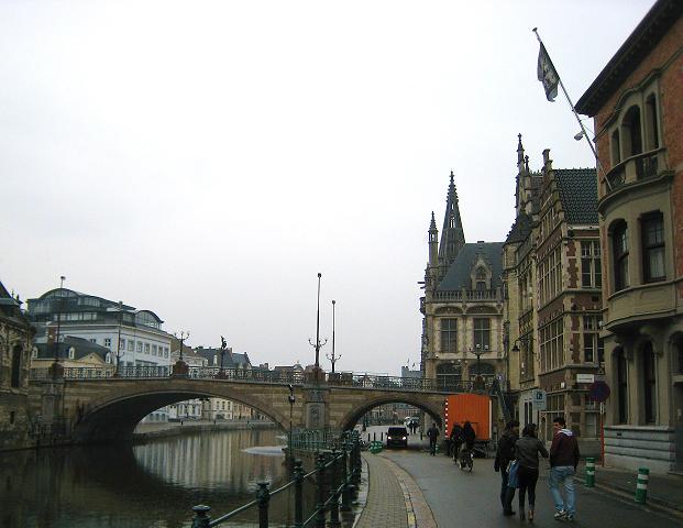 鐘楼と繊維ホールを観光した後、聖ミヒエル橋の方へ歩いて行きました。レイエ川に架かる石造りの橋です。この橋を渡り、後ろを振り向くと、聖ニコラス教会、鐘楼、聖バーフ大聖堂の塔が連なっている様子が見られます。