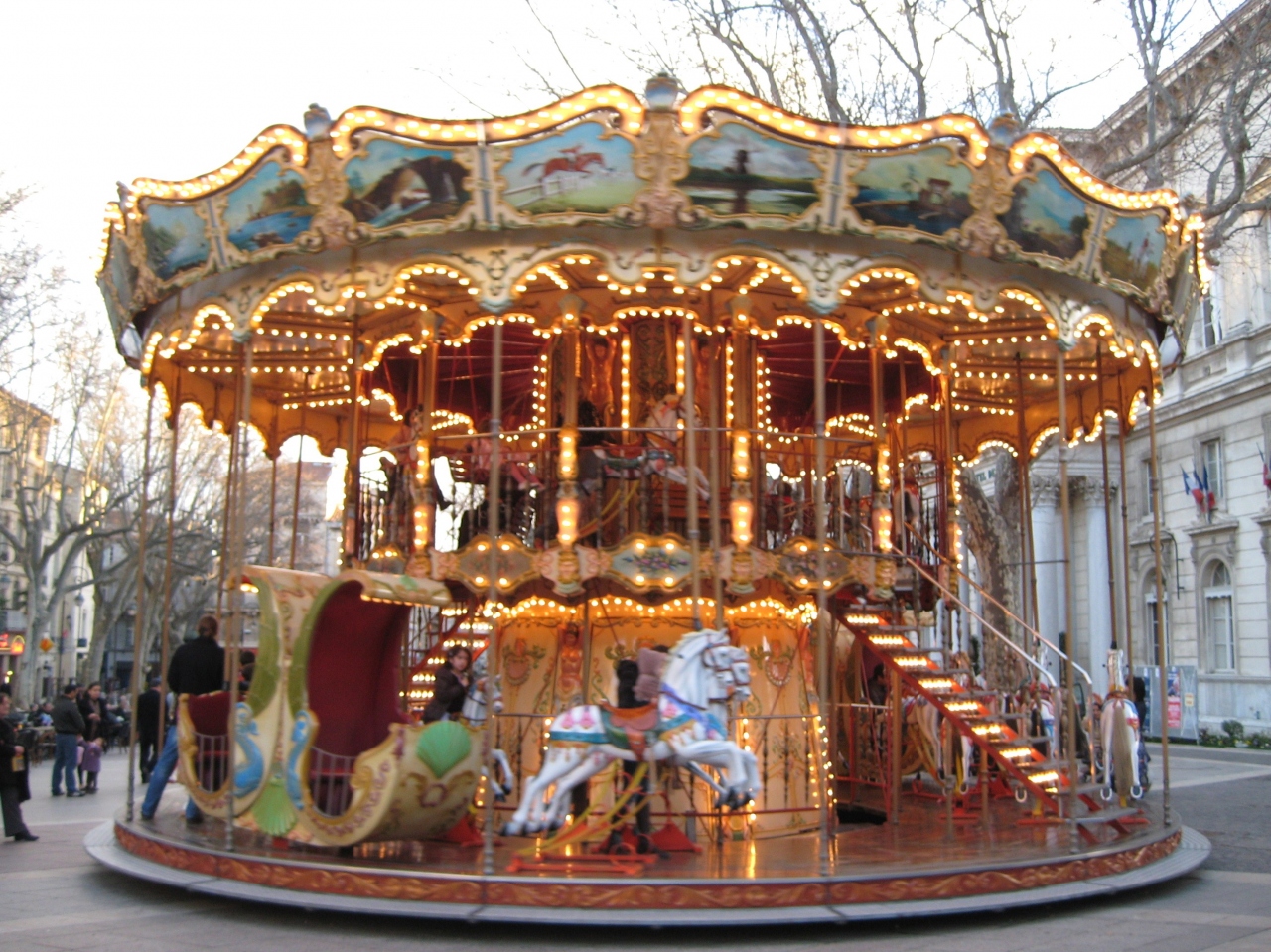 アヴィニョン旧市街の中心が時計台広場になります。広場の西側には市庁舎、オペラ劇場など歴史のある大きな建物が、南側はレピュブリック通りに面し、東側はレストランやカフェが連なり、広場にテーブルを並べています。北側はそのまま法王庁に続いて行きます。また広場の中央にはフランスっぽくメリーゴーランドが設置され、親に連れてきてもらった子供が乗ると、ときどきグルグル周っていました。(常に周っているほどの利用者はいなかった。)