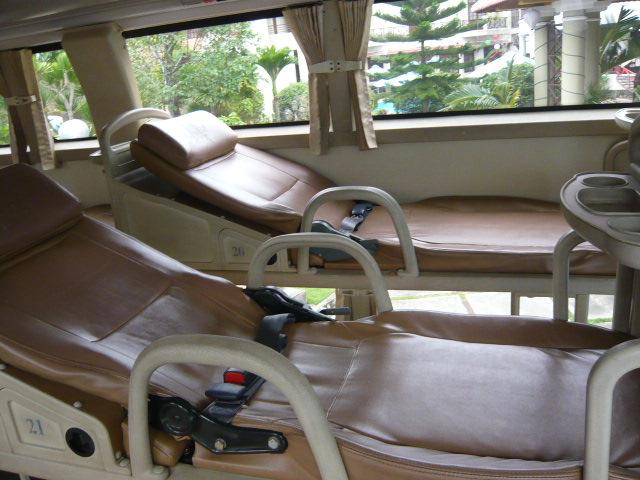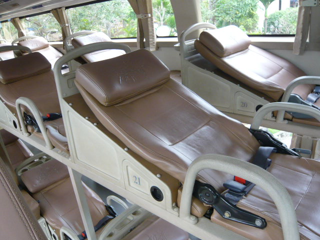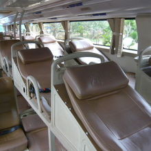 車内は2段ベットのような座席が3列。足を投げ出して、座椅子のように座ります。背もたれは倒れるので、寝た状態の姿勢になるのです。これならば長時間の移動もらくらくです。