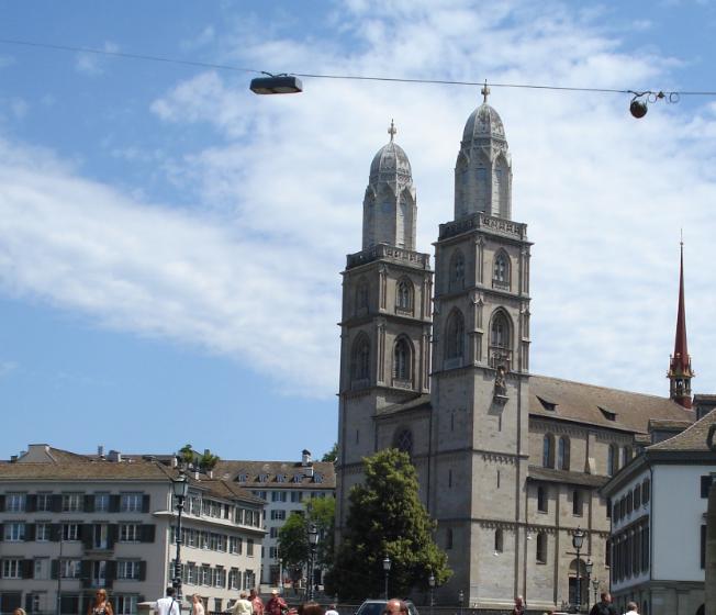 チューリッヒの街の湖にほど近いところに、二本の塔を持つ大聖堂が見えてきます。