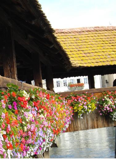 ベルンの駅を降りて、目の前が湖です。その湖に、屋根のあるカペル橋が架かっています。橋は、その壁がすべて花に覆われて、本当に美しい。