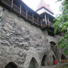 城壁の入口はアレクサンドル・ネフスキー聖堂から近い場所にありました。石段の階段横に、係の人が椅子に座り寒そうに(雨が降っていたため)していました。その横には「1ユーロ/1ドル/15エストニアクローン」と入場料の表示がありました。