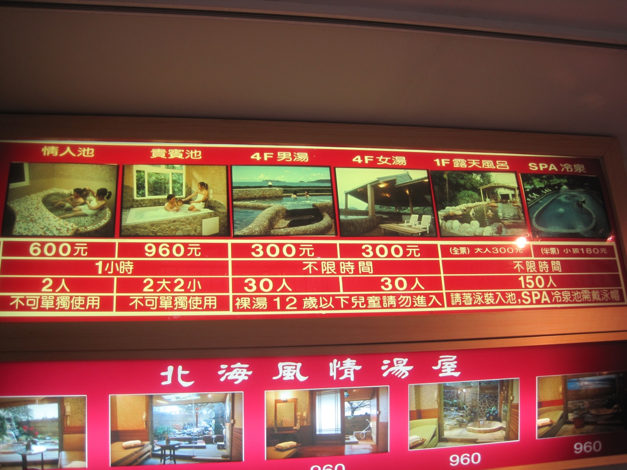 家族風呂も含め、いろんな種類の浴室があるようですが、4F露天風呂(男女別、水着不要)を利用しました。(料金は300元) お風呂は、熱め、ぬるめ、水の3種類あり、広々しています。 男風呂からは海が眺められ、眺望最高。 海を背にして入浴すると、緑の木々が生い茂り、そちらもなかなか良いです。
