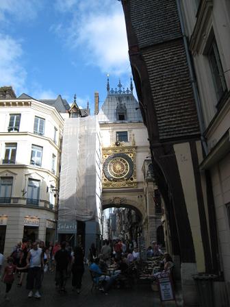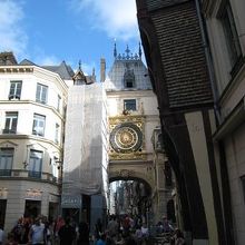 ルーアン大聖堂へ向かって賑わう通りを歩いていると、アーチ型の門のような場所に大時計があります。大時計の真上にある銀色と黒色をした球体は月の満ち欠けを表しているそうです。行く日により見方が変わるのでしょう。
