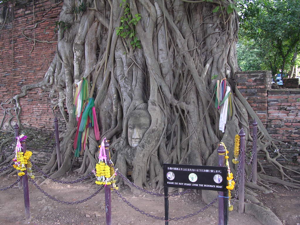 昔仏像を盗む際に頭と胴体を分離して運び出していて、その際に忘れた頭が木の成長により地上に現れたという神秘な仏様の頭です。