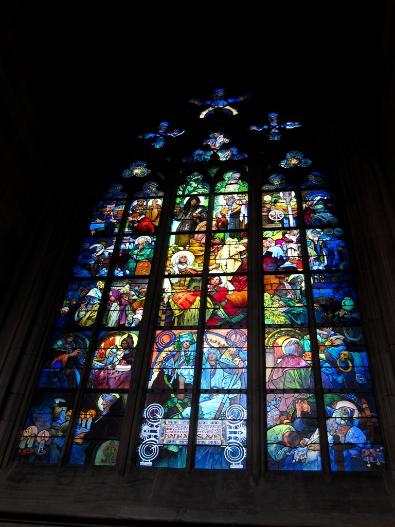 多くの観光客でごったがえし、静かで荘厳な雰囲気を期待するのは困難です。しかし、入り口を入って左側(北側)手前から3番目に他のステンドグラスとは明らかに異質な魅力を発するムハの作品があります。他のステンドグラスもそれぞれ素晴らしいのですが、偏見や思い込みなしにムハの作品が突出していて、ずいぶん長いこと眺めていました。是非お見逃しなく!しばらく修復していたとの情報があり心配でしたが、2012年4月現在修復していませんでした。