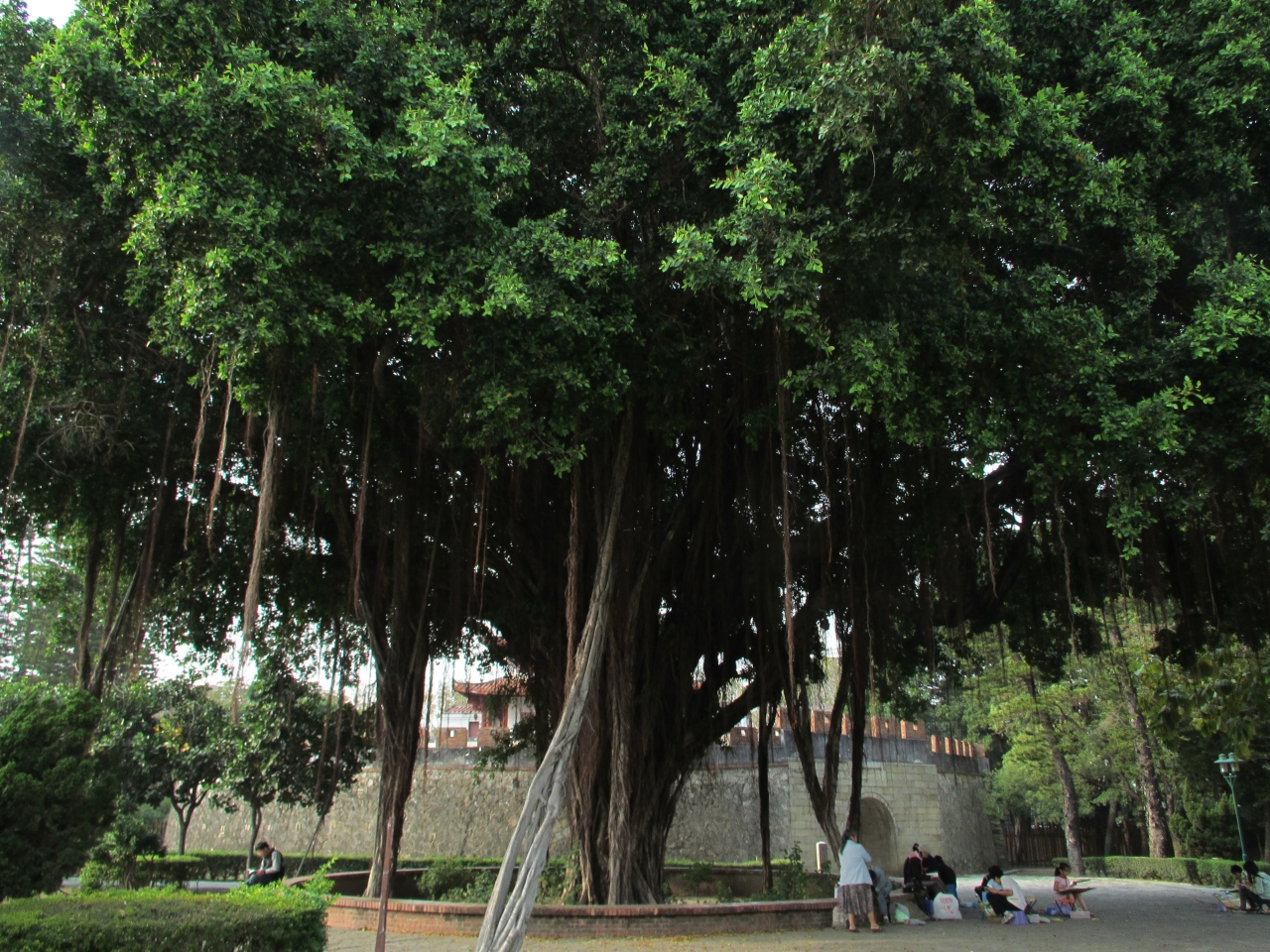 公園内に保存されており、城壁の前には巨大なガジュマルの樹がそびえたち、その木陰で子供たちがスケッチに励んでいました。