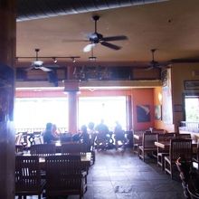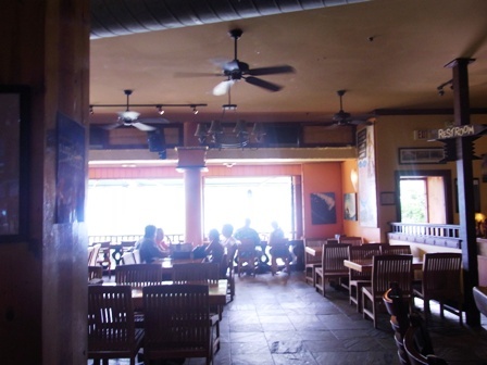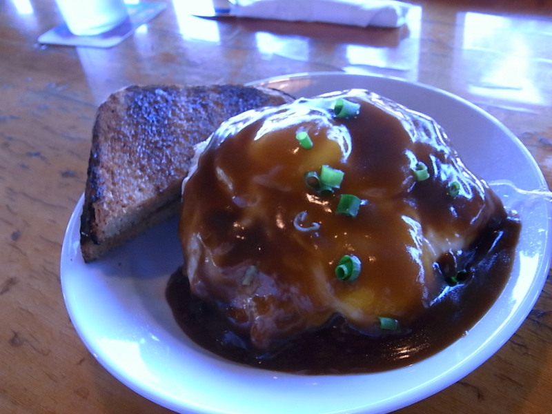 ワイキキビーチが目の前で風が気持ちいいサイコーのロケーション。窓側のビーチを眺めるカウンターになっている席がオススメ!ハワイの空気を存分に吸いながら、真っ青の空と海を眺めながらの食事はたまりません。〔ワイキキで一番うま~い極上ロコモコの店〕と看板が掲げてあったので、迷わずロコモコをオーダーしました。出てきたロコモコにはなぜか、トーストが添えてあるりました。もちろん、グレービーソース&卵とハンバーグの下はごはんなのに!すっごい穀物の組み合わせです(笑)。気になるお味は、納得です!ハンバーグのお肉はとても肉厚でボリューム満点!ジューシーという感じではなく、硬いかなとも思ったんだけど、濃い目のしっかりめのグレービーソースとよく合っていました。上にパラッとかかっているねぎといい、とても日本人好みのロコモコです。これは、また絶対食べに来たいです。220gぐらいの巨大ハンバーグだったんだけど、ペロリ平らげました。夜は、ライブなどもやっているみたいなので、ハワイ気分が思いっきり味わいたい方!お勧め。日本語メニューもあるから安心♪
