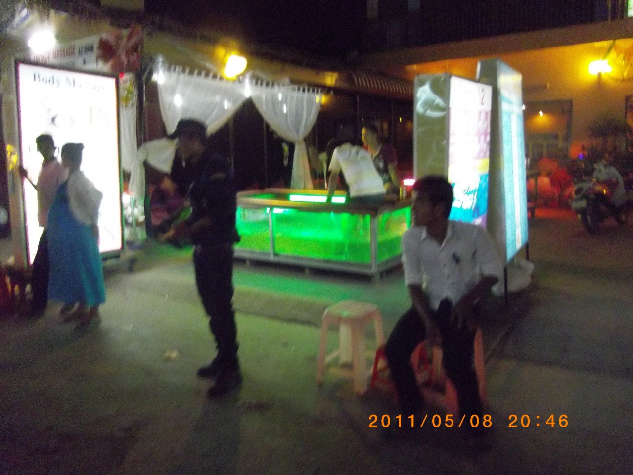 マッサージ店や足の皮を食べてくれる魚の水槽がたくさん並んでいます。