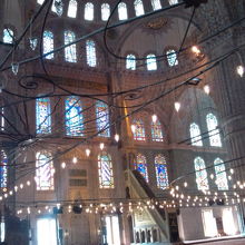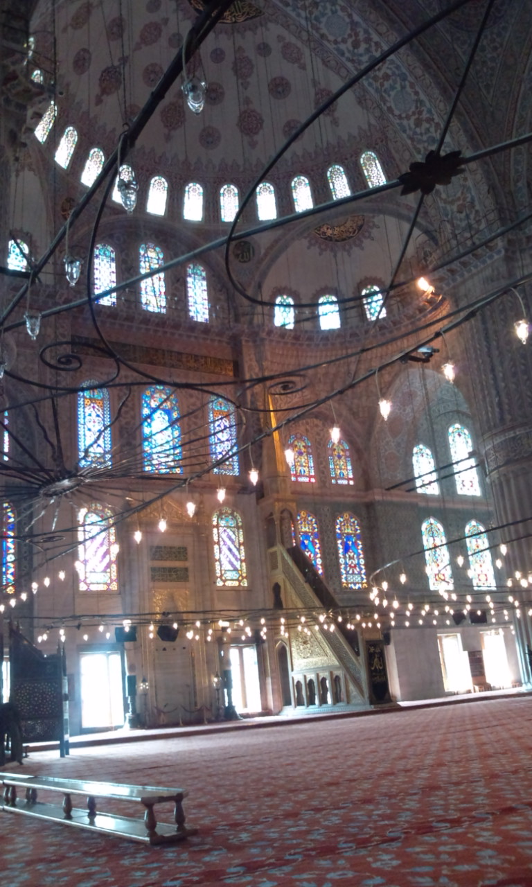 イスタンブールで最も有名なモスクです。そのモスクの中にも入れます。モスクの中は土足禁止で入り口で靴を脱ぎました。モスクの中に入って、その幻想的な光景に一瞬見とれました。天井のタイルが鮮やかで、ブルーモスクと言われているように、ブルーのタイルがメインに使われていました。中に飾られたシンプルな多数のランプも印象に残っています。イスラムっぽさが一番感じられた場所です。