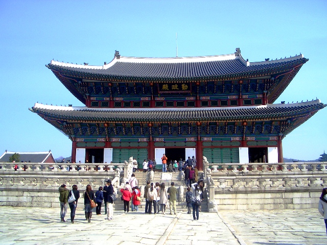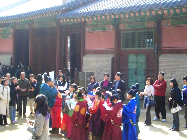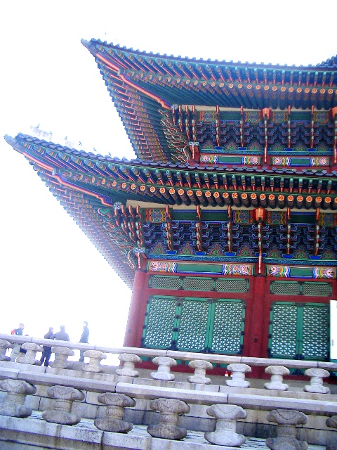 重々しい警備隊員に「景福宮入り口は」と尋ねる。
