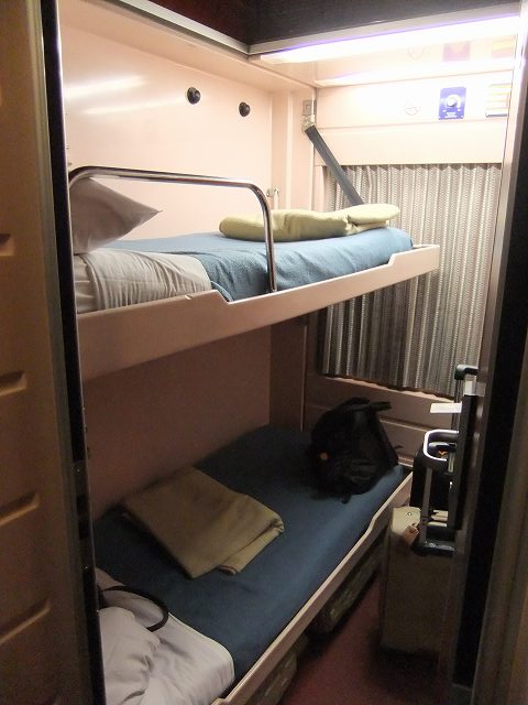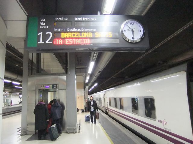 グラナダ発夜10時ごろ、バルセロナ着朝9時半。インターネットのRenfeのサイトでチケットを取りました。2人用の個室寝台で139Eでした。2ヶ月前から買えます。早割りあり。出発30分位前に入線、乗車できました。ホームに係員がいて部屋に案内してくれます。狭いけれどシャワー、洗面トイレが付いていました。8時半頃に車掌さんが部屋をノックして起こしてくれました。寝てる間に移動できますので時間もホテル代も節約できます。車窓風景は楽しめませんが・・・・・。