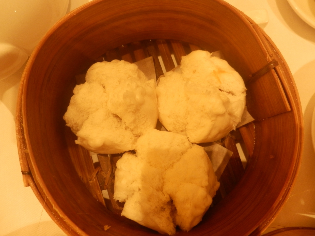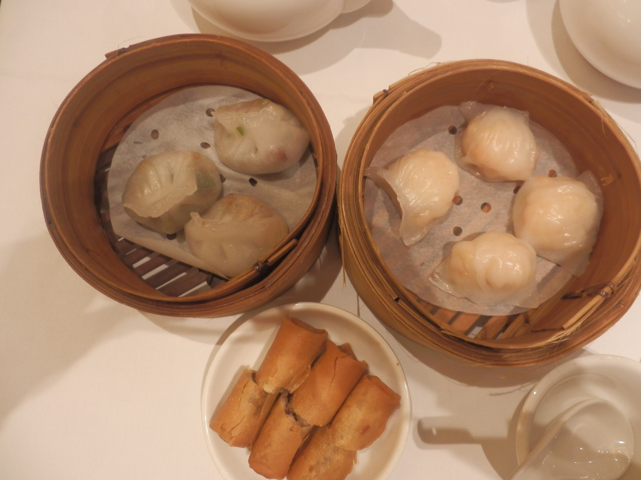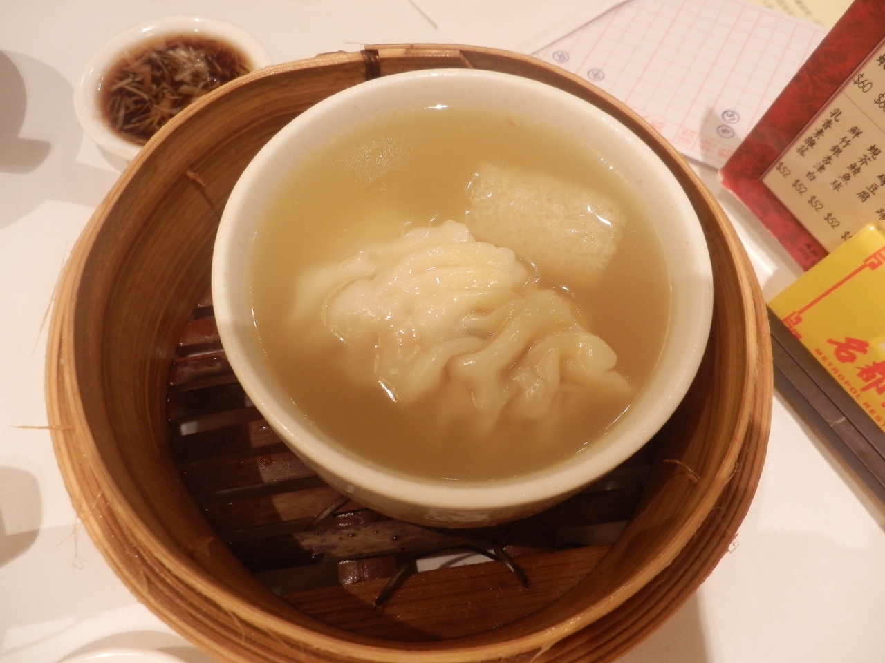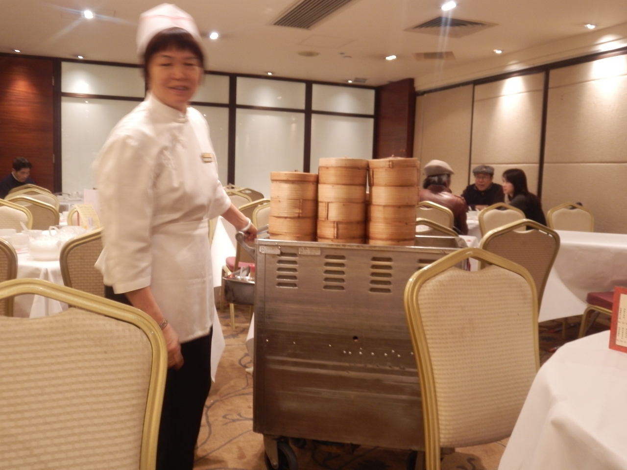 飲茶はワゴン式で、いろいろなものがワゴンで運ばれてくる。自分で行って、セイロの中を開けてみせたもらい、中を見ることができる。注文すると自分で伝票を持って行きチェックするシステム。肉まん、スープどれも美味しかった。