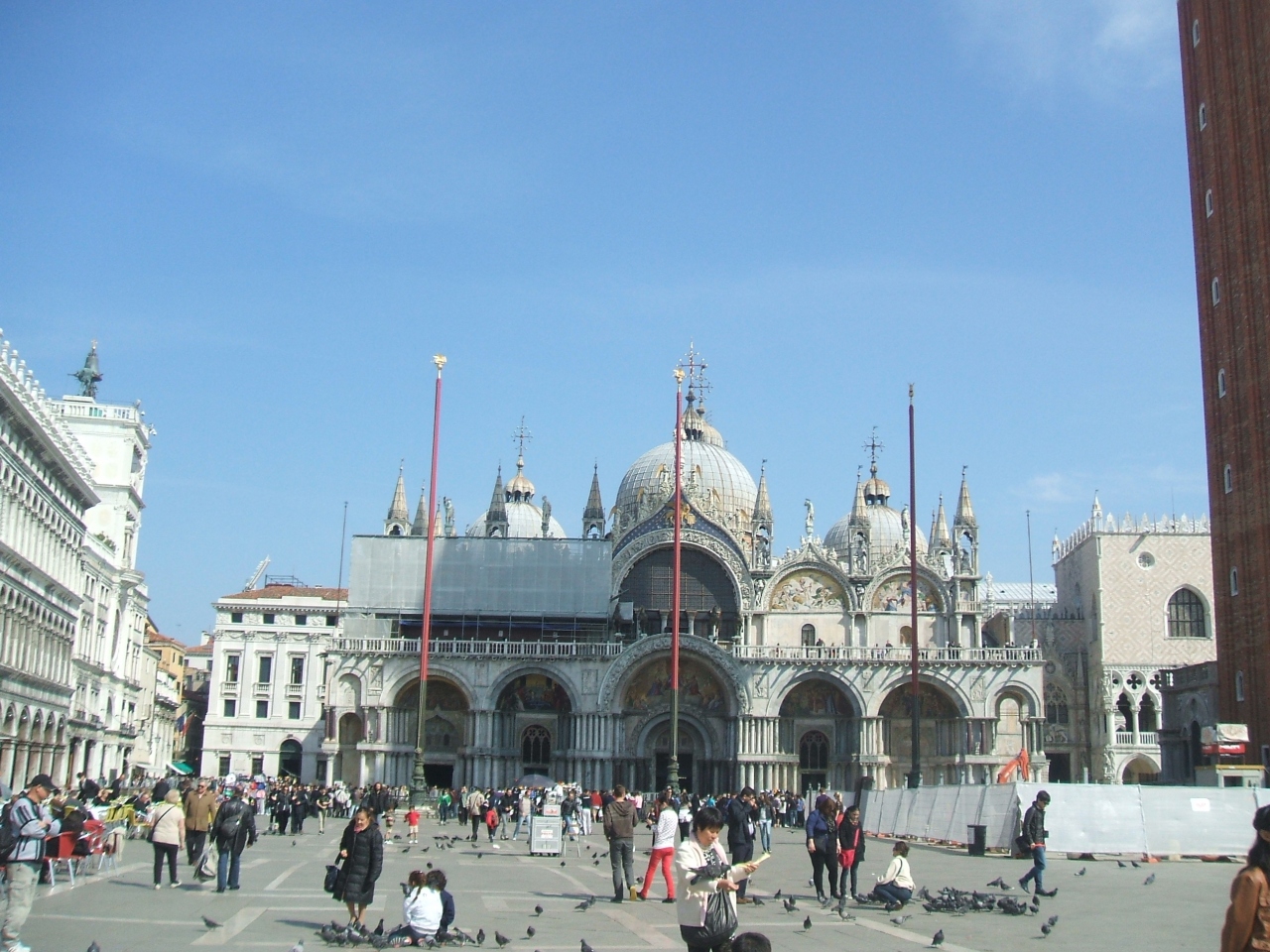 サンマルコ寺院はヴェネチアの顔である寺院である。初めて中に入った瞬間、壁天井に広がるモザイク画に驚いた。どこもかしこも黄金のモザイク画なのだ。これほどの黄金に囲まれた教会は見たことがない。テラスからの景色は漫画のアリアにも出てきたそのまんまの景色だった。