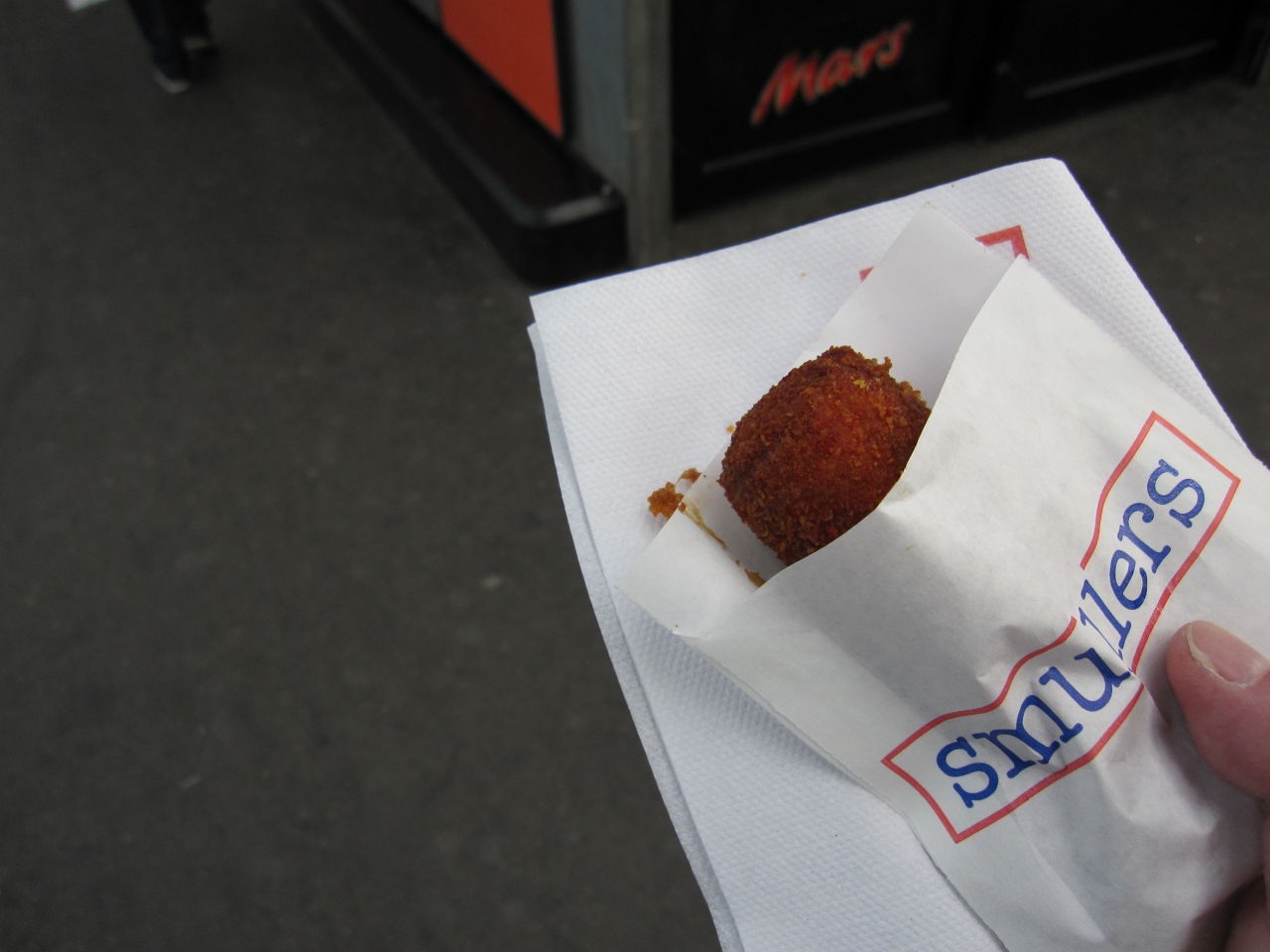 アムステルダム中央駅にはコロッケやハンバーガーの自販機があります。自販機といってもコインをいれて扉を開くタイプです。店は横にあり後ろ側からは随時補充されているので物はできたて。さらに自販機の中で暖められています。ハンバーガーは日本のマクドナルド等とは違い塩とコショウが効いてこれはこれで美味しいです。観光で歩き回った後にはお勧めです。コロッケ1.4ユーロ。ハンバーガー2.0ユーロ。(2009年5月当時)