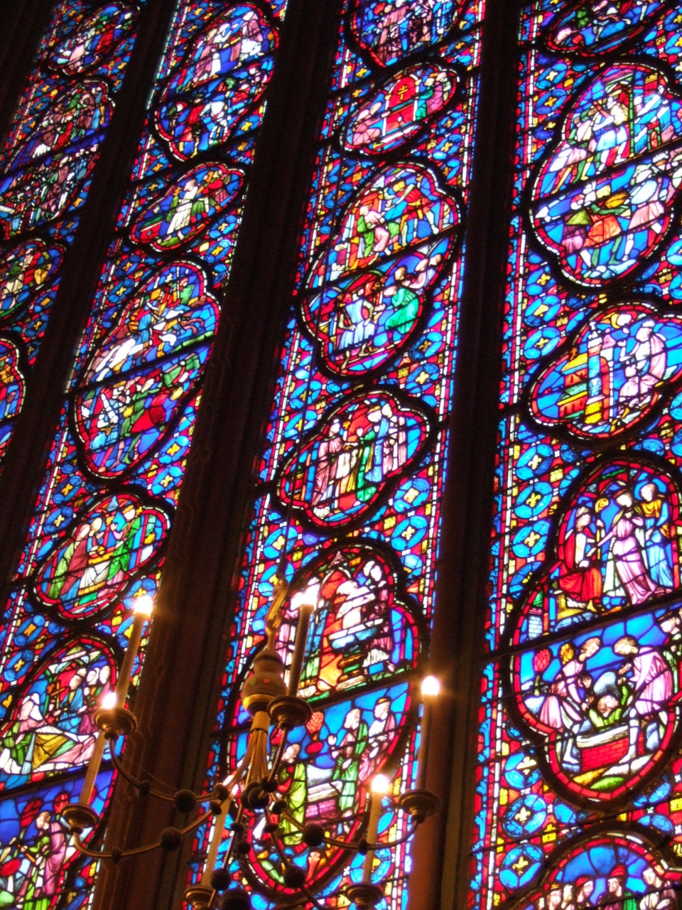 サント・シャペルはミュージアム・パスが利用可でした。1階から入った時は、一般的なゴシック様式のごく普通の教会かと思いましたが、2階に上がると別世界が広がっていました。そこはステンドグラスで埋め尽くされた美しい空間で、これらのステンドグラスは聖書の物語を表しているとのことです。またバラ窓や床の文様(絵)までもが美しいものでした。
