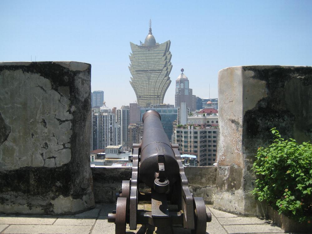 聖パウロ天主堂跡(大聖堂)の前を下って、丘の下を周りこむようにモンテの砦へ石畳の坂道を登って行きました。モンテの砦には幾つかの大砲が壁に沿って並んでいました。事前調査が不十分でこの時は分からなかったのですが、大砲の先に不思議な形の建築物が見えたので、無計画な旅の私はその方角に向かって行くことになりました。モンテの砦から見たマカオ市街は私の好奇心を刺激してくれましたので、皆さんもマカオ訪問の最初にこの砦へ登られることをお薦めします。
