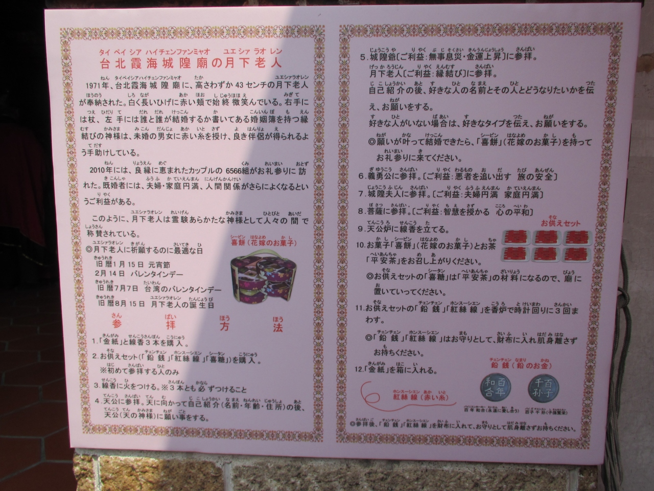もともとは城隍廟なので、地獄の裁判官だとか地域の守り神などの主神を祀っている場所です。ところが、ここで祀っている月下老人という恋愛の神様がご利益あらたかということで恋愛成就スポットとしてブレイク。