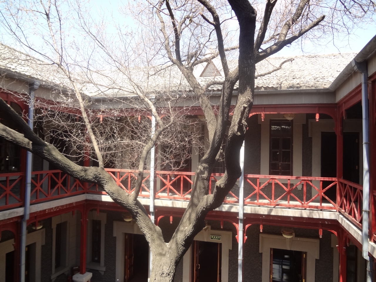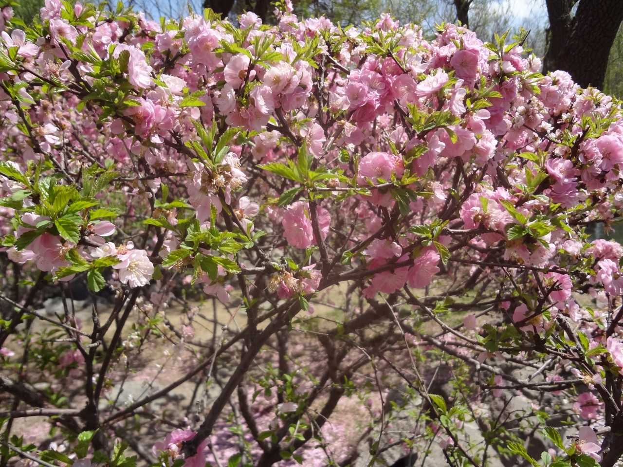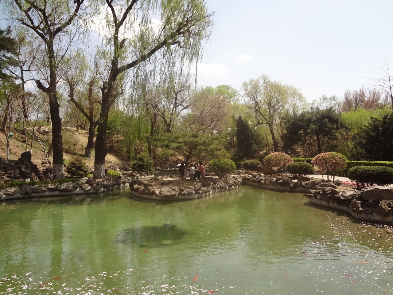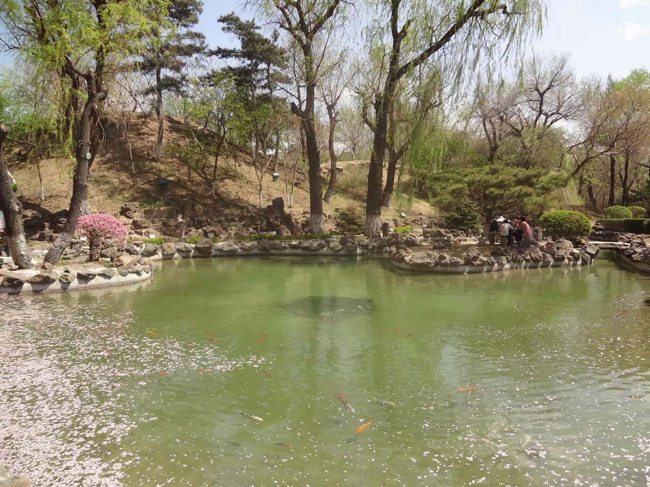 偽満皇宮博物院は、いま春蘭満、いろんな花や木々が咲き誇っています。日本人にとっては、重い歴史を認識を受け止める場所、そればかりではなく、今の中国の人たちは、歴史とともに自然をもたいせつにし始めているのがこの博物院の建物と素晴らしい庭ではないでしょうか。かって、日本人の庭師が創ったこの美しい日本庭園は、今春満開、日本の桜が散り始めています、この赤い桜花に名前があります。池の錦鯉は池面の散桜花とたわむれています、そして小高い亭では、来館者の憩いの場所となっています。博物院をめぐる庭の草、木々、花にはちゃんと名札がついています。