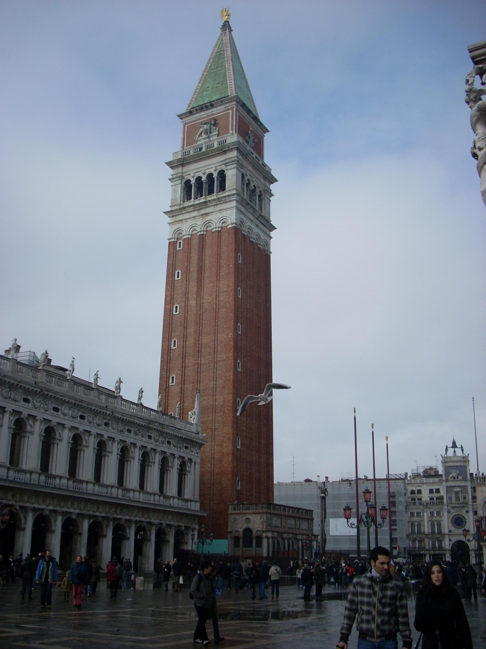 イタリアのベネチアのサン・マルコ広場にある鐘楼の上には、エレベーターを使って上がることができます。そこからは、ベネチアのサン・マルコ運河が一望できます。対岸のサン・ジョルジュ・マッジョーレ教会も見えます。
