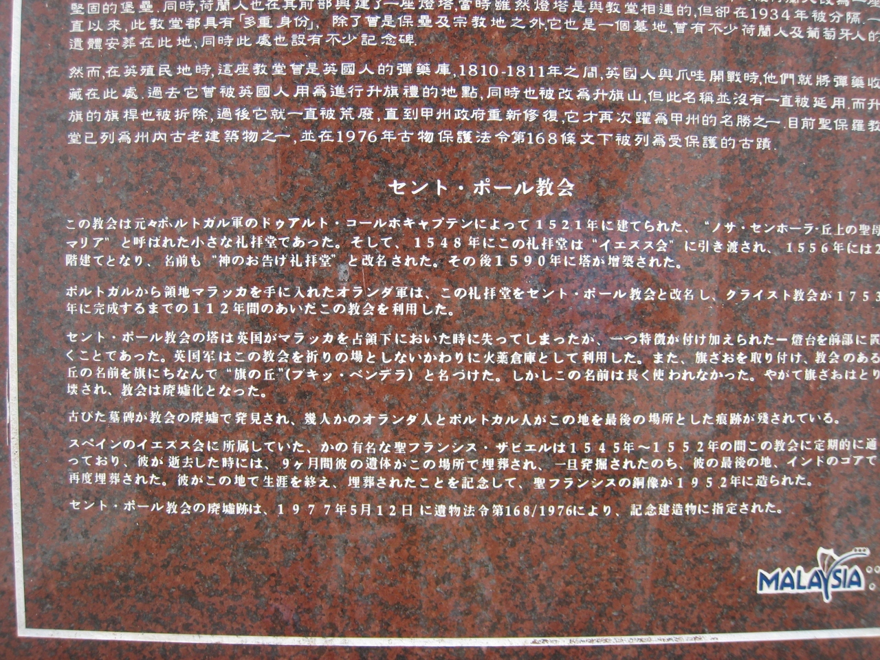 日本語ツアーで参加。歴史の中で大切な拠点だったのに、時代の流れの中で取り残されてたたずむ街という印象を受けました。特にセントポール教会は、フランシスコ・ザビエルの遺体が安置されていたと言うことで、日本語の説明版もありました。