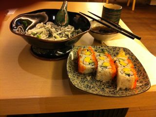 今回選んだのは冷やしうどんとカリフォルニアロールの組み合わせ。