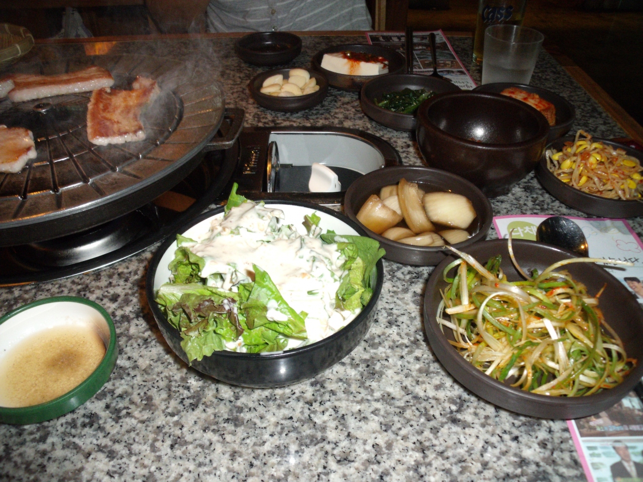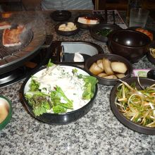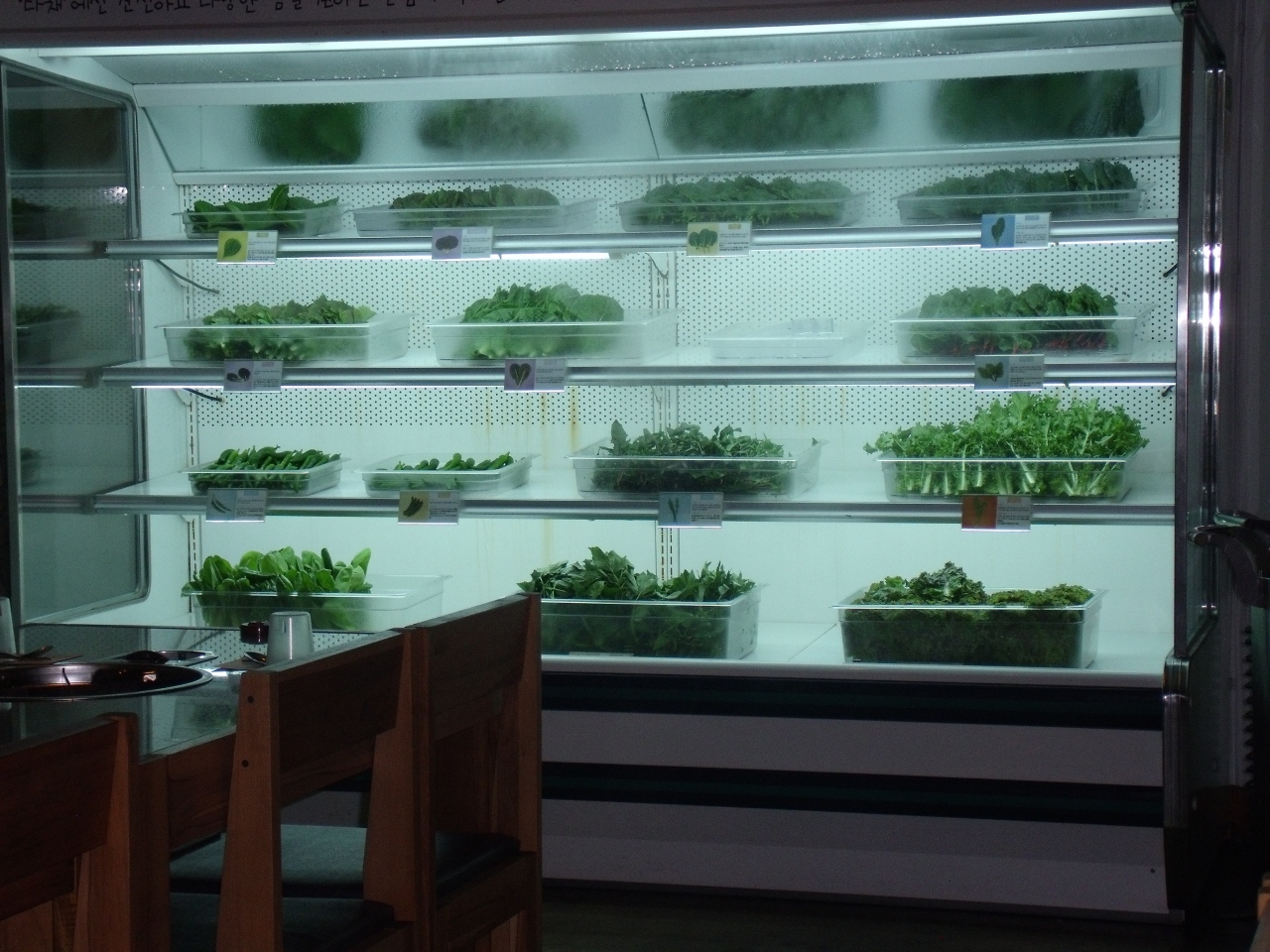 韓国では、おかず(キムチ等)はおかわり自由で、頼めば持ってきてくれます。 ここのシステムは野菜がオープンの冷蔵庫にあり、自分で取ってくるシステムになっています。そのため、頼むのが苦手の人や、好きなものを好きなだけ食べたい場合、こちらのほうがいいと思います。