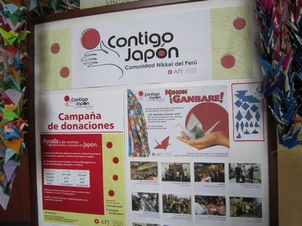 東日本大地震に遭った方たちへの応援メッセージと折り鶴。頑張れニッポンと書かれた大きなポスターも貼られていた。何だか今まで殆ど知らなかったペルーがとても身近な国に感じられた。