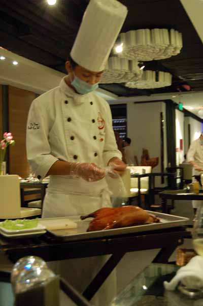 北京ダックは目の前で切り分けてくれます。ダックは半羽から頼めます。