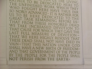 今回はReflecting Poolが工事中で水がなくて残念でしたが、リンカーンは以前と変わらず偉大な姿を見せていました。前回は忘れていた「人民の人民による人民のための政治」の写真をしっかりと撮ってきました。下の三行に書いてあります。読んでみてくださいね!(^_-)