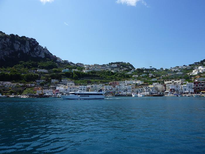 ナポリのモロベベレッロ港からカプリ島のマリーナグランデ港まで高速船で移動しました。インターネットのサイトで大体の出発時間帯を調べていて、10:00発の便に乗りました。料金は16ユーロでした。所要時間は45分。
