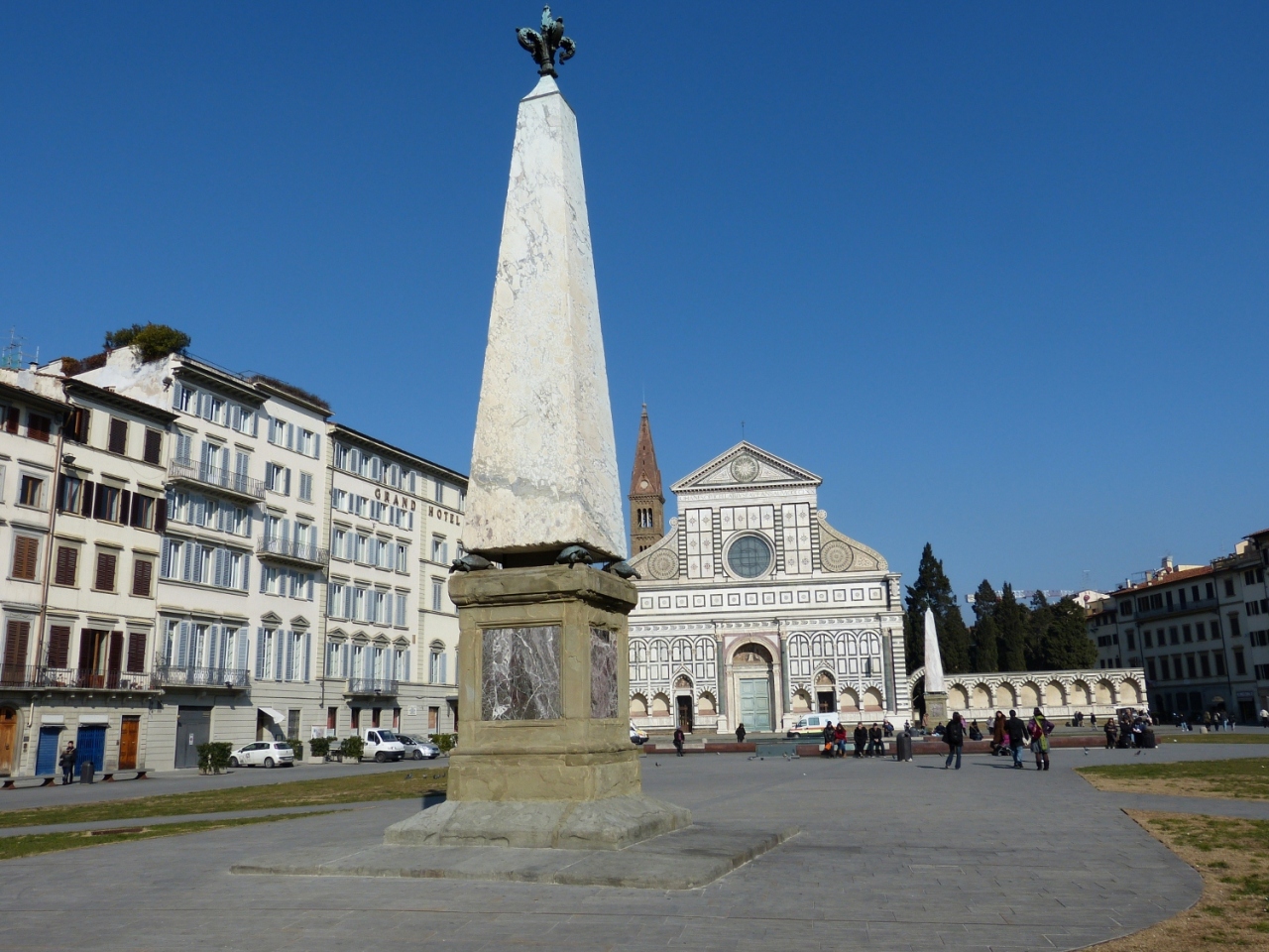 久々に訪れると、長く行われていたサンタマリアノベッラ広場の工事が終わり、きれいな姿に生まれ変わっていました!オベリスクも綺麗に修復され、フィレンツェの紋章「フィレンツェのユリ」のモニュメントを支えるカメさんたちも健在でした。カメさんは、コジモ1世のシンボルなんだとか...コジモ1世の時代は、ここで馬車レースが行われていたようですが、今は車の進入も厳しく規制されているようで、静かな広場です。
