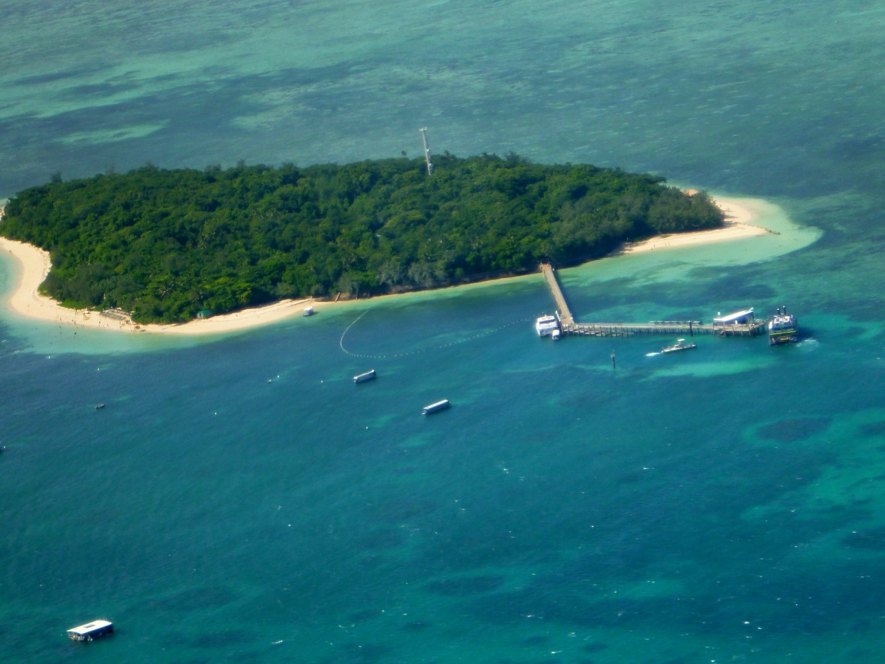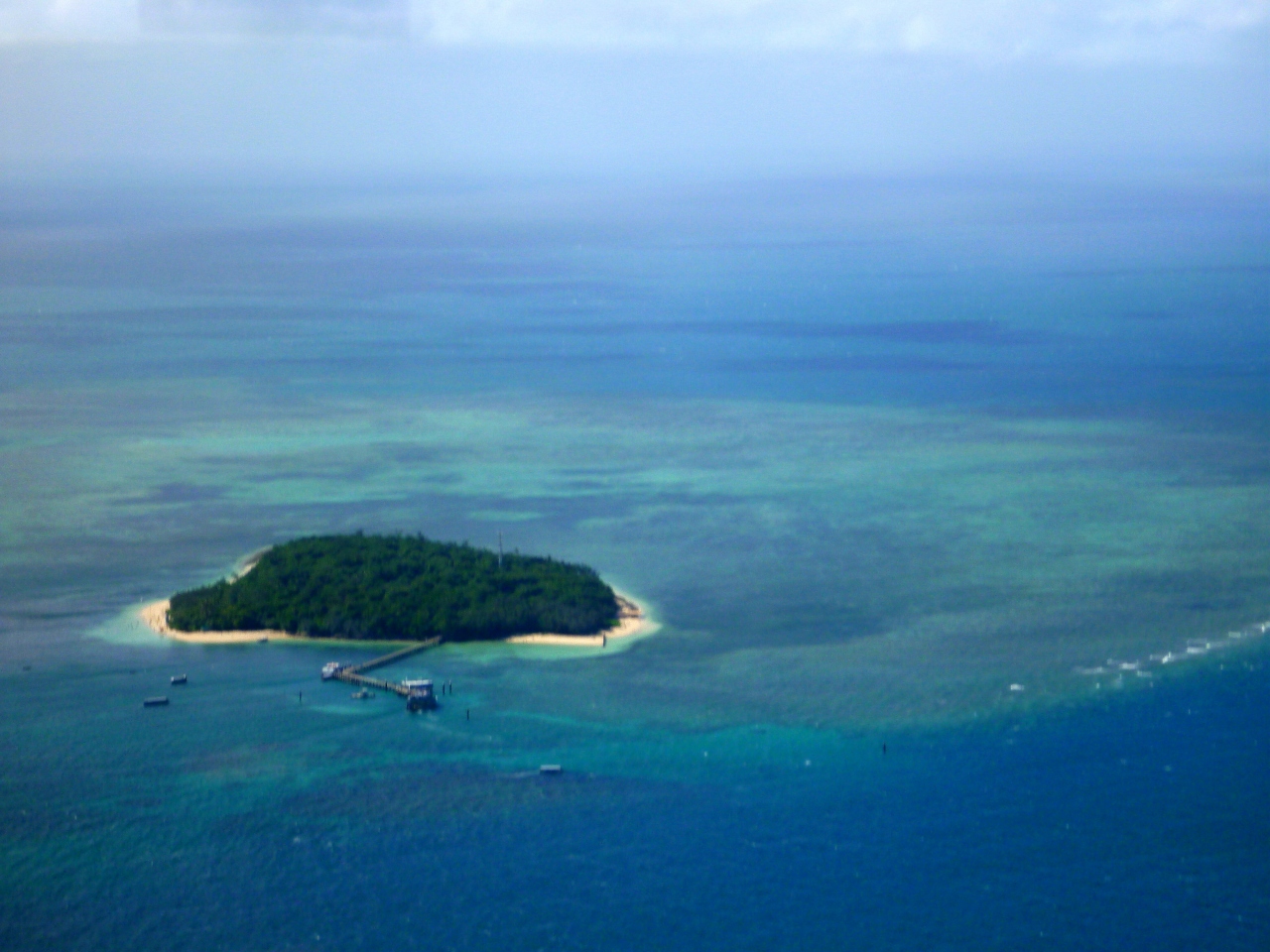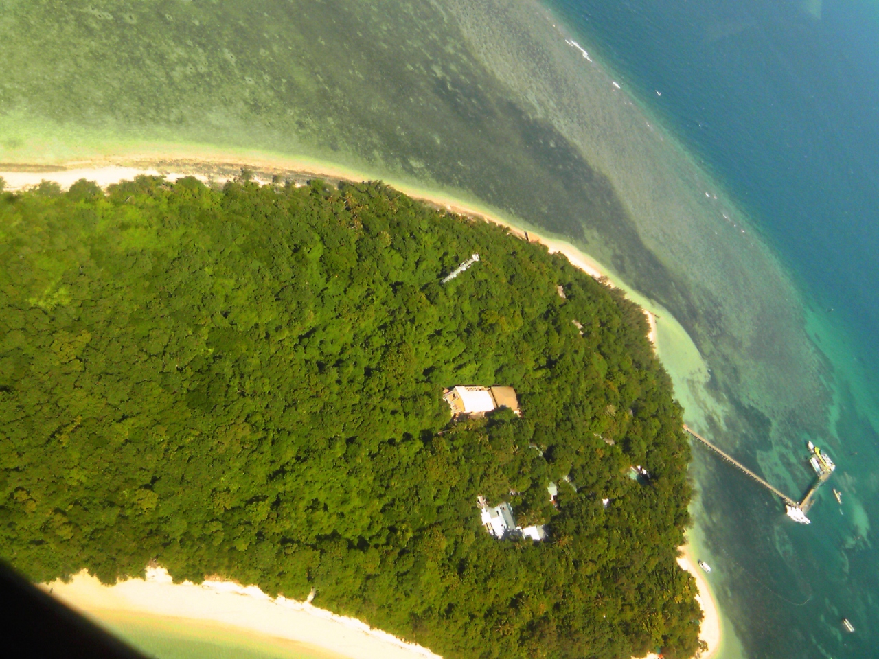 島内からではなかなかわかりませんが、上空からは島を大きく取り囲む見事な珊瑚礁が見えます。グレートバリアリーフの中でもケアンズから比較的近く多くの観光客がやってくるため、珊瑚の状態はあまりよくないとも聞きますが、沖のほうは元気なのではないかと見えます。