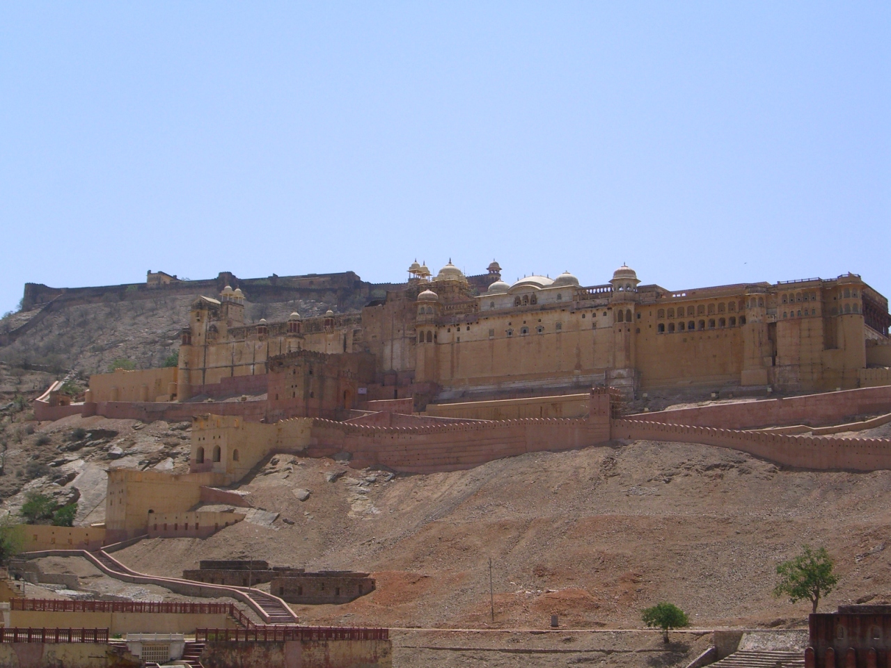 岩山に城があり、麓から城までは急坂のため4WDのタクシーにて登りました。像のタクシーもあるようですが見かけませんでした。外観の城壁の色は岩山と同じ茶色っぽい色です。城内の窓からは風が抜けるように作られていて、あまり暑くは感じませんでした。中庭には泉水の庭園があり、壁面には幾何学的模様の装飾があり、最上階からは景色が見下ろせました。カメラ持ち込み料として25インドルピー取られました。