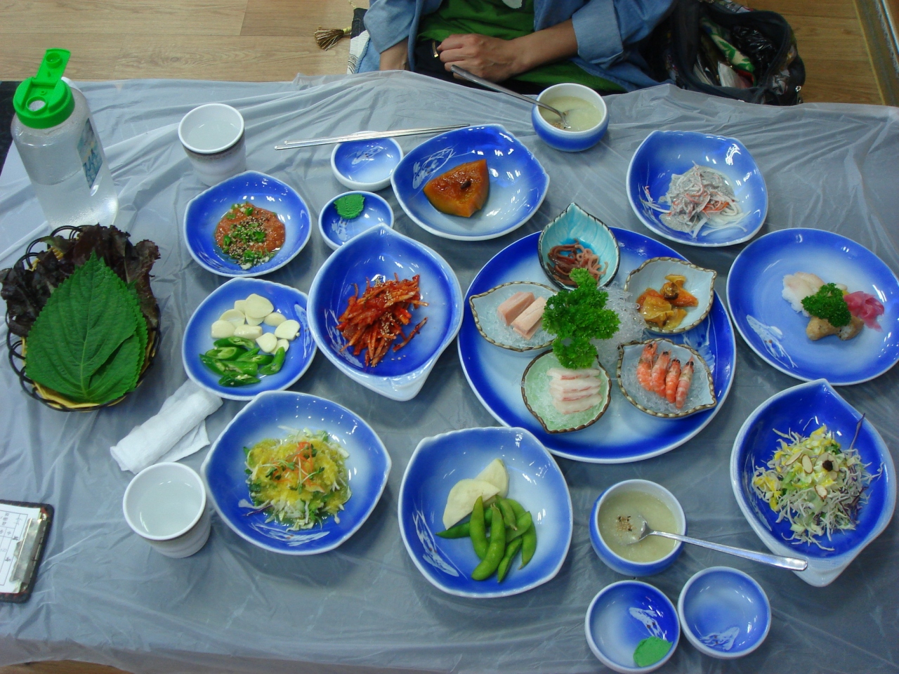 例によりキムチ、サラダ、その他たくさんの前菜たち(ほとんど凍ったままのマグロとか、茹でてある甘エビとか^^;含む)がテーブル一杯に並べられ、それらをちょこちょこ食べて待つ間に外から運ばれてきた舟盛りならぬ「お魚盛り」^^が到着。すごい量。そして、えっ…全部白い…?アジュンマにこれは何かとたずねると平然と「ヒラメ、タイ、スズキ」。えっ、あのう、ウロとボラは…?