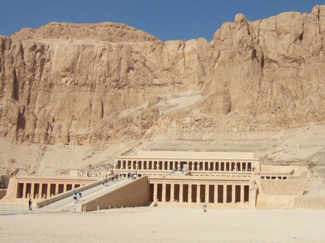 ルクソールに着いて、初めに訪れた観光地でした。移動手段がないので、西岸の観光ツアーを利用しました。ルクソールには他に有名な遺跡が多く、この遺跡はガイドブックにもそれほど詳しく紹介されておらず、あまり注目されていないのではと思っていましたが、実物は以外にスケールが大きく、切り立った絶壁の下に壮大な神殿がありました。中の壁画の色彩も良く保存されており、美しかったです。ハトシェプストはトトメス1世の娘で古代エジプト唯一人の女性ファラオだそうです。古代エジプト史を少し学んでから、訪れるとより楽しめると思いました。