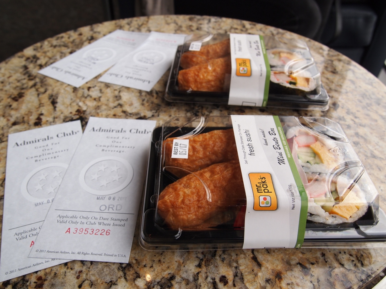JALを利用したため。チェックインはAAのカウンターでした。 初めてなので、良く判らないのですが、このターミナルは、国内線と国際線が一緒になっていませんか? AAのラウンジを使えたのですが、JALのお客さんには、ドリンク券(有料のビール他)が2枚と、稲荷寿司の引換券がもらえました。