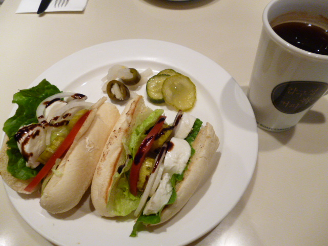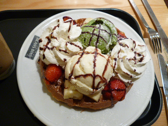 疲れたら休憩。普通のコーヒーチェーンの他にもベーグルの店、アイスやワッフルの店、ちょっと値のはるイタリアンカフェ等々、各階にそれぞれタイプの違ったカフェがあるのもよい。。(ここではワッフルと地下で食べたサンドイッチの写真をのせました)。お財布事情と気分で色々選べます。上にはフードコートもあります。